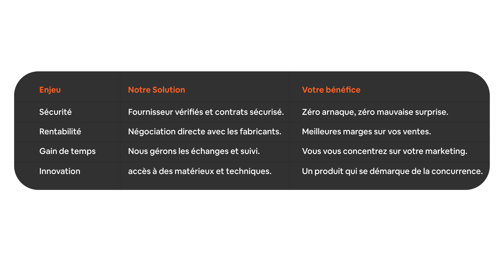 Nous identifions les partenaires les plus adaptés à la nature de votre produit (Textile, Cosmétique, Tech, Mobilier, etc.).